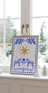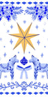 En stemningsfuld folk-inspireret vinterplakat af Aliya Putrus: En gylden stjerne i centrum omgivet af snefnug, bær og en dekorativ sløjfe, med en lille dala-hest som charmerende detalje. Blå, hvide og brune nuancer skaber en skandinavisk julestemning, varm og nostalgisk. Perfekt til entré, stue eller børneværelse i højtiden.