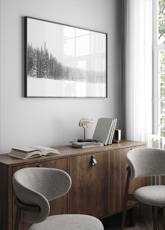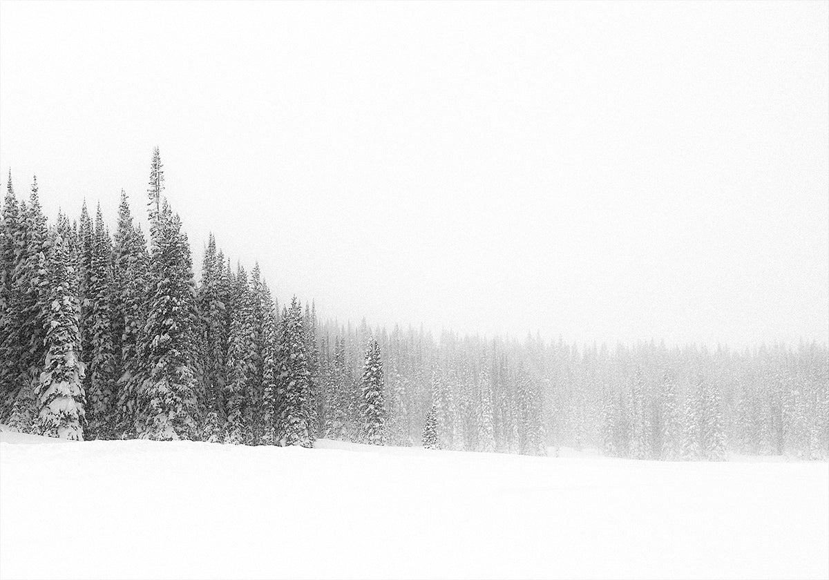 Forest for the Trees af Kirk Cypel indfanger en stille vinterdag i skoven: slanke, mørke stammer rejser sig gennem tåge og rim, mens sneen dæmper lydene og lader kulden glimte i det blålige lys. Et roligt, poetisk landskab med dybde og rytme, hvor øjet vandrer mellem træernes grafiske linjer. En nordisk vinterro, der inviterer til fordybelse.