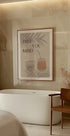 Denne beroligende illustration fremkalder et stille øjeblik med tropisk nærvær. Et tændt duftlys med æteriske olier (appelsin, mynte og eukalyptus) står ved siden af et forfriskende glas juice, badet i bløde skygger fra palmeblade. Ordene "Frigør Dit Sind" opfordrer til pause og ro. Med dæmpede farver og en minimalistisk sommervibe udstråler plakaten spa-lignende ro — ideel til rum, der søger fred, fokus og naturlig balance.