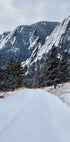 Et vinterstille øjeblik fra Boulders ikoniske Flatirons: en snedækket sti i Chautauqua Park fører ind mod de takkede klipper, mens mørkegrønne fyrretræer og let tåge skaber en kølig, dyster stemning. Over det hele hænger en overskyet himmel, og naturens ro føles næsten hørbar. Fotografi af Del Mundo Imagery.