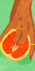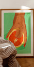 Grapefruit Touch Plakat er et markant og provokerende moderne kunstværk, der udforsker temaer som sensualitet, styrke og legende oprør. Det viser en hånd med dyb brun hud, udsmykket med guldringe og dristigt rødmalede negle, der indrammer en halveret grapefrugt i en symbolsk og antydende gestus. På en frisk, tekstureret grøn baggrund skaber de varme toner fra hånden og frugten en fængende kontrast. Dette dristige værk er perfekt til moderne rum, der omfavner kropspositivitet, selvudtryk og ubetinget selvtillid.