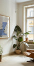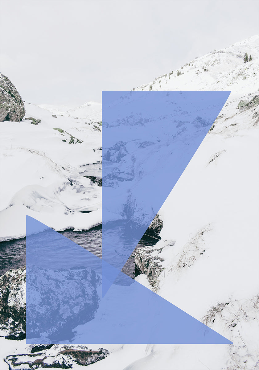 Geometric Serenity af Athene Fritsch indfanger stilheden i et vinterligt landskab gennem geometriske former og kølige blå nuancer. Triangler og lagdelte flader skitserer bjergtoppe og en frossen strøm, hvor lys og skygge skaber harmonisk dybde og moderne minimal ro. Den kolde palet af blå og hvid fremhæver tydelig kontrast.