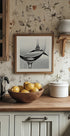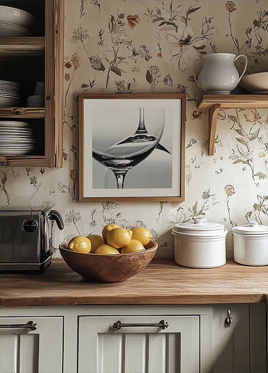 Minimalistisk og monokrom plakat, hvor to vinglas danner ren geometri: det ene står, det andet vender på hovedet. De kurvede silhuetter spejler hinanden i skarpt lys og bløde skygger, mens negativt rum skaber ro og balance. Et elegant stilleben, perfekt til køkken, barvogn eller spisestue. Subtil og sofistikeret, med en stille dramatik.