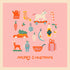 En lyserød, nostalgisk juleillustration fyldt med små, charmerende julemotiver som gave, rensdyr, julekugler, legetøjsrobot, kage, juletræsbil og stokke. Stilen er retro og farverne er bløde og varme, og teksten “Merry Christmas” står nederst.