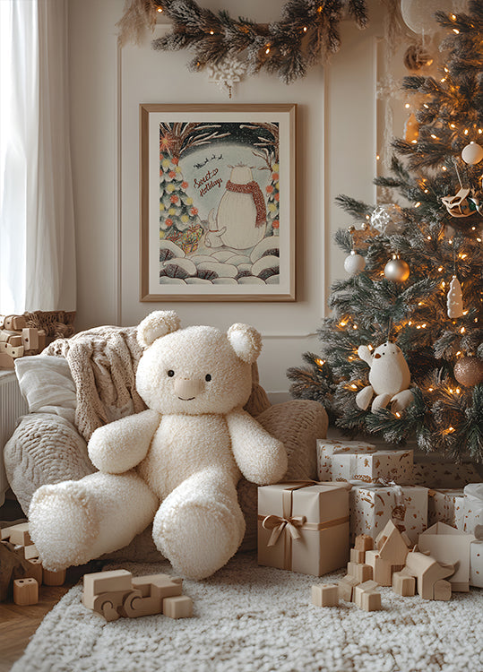 Med Heart of the Forest lader Olena Kovalova os træde ind i en stille skovlysning, hvor en bjørn og en kanin mødes mellem snefnug og graner. Vintageinspirerede juletoner i rød, grøn og teal giver varme til den frostklare scene og vækker barndommens eventyrlyst og vinterhygge til live. En sød hyldest til julens ro i naturens hjerte.