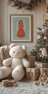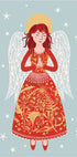 An ethereal red‑haired angel by artist Nic Squirrell stands in quiet prayer beneath a star‑strewn midnight sky, halo aglow and soft wings unfurled. A folk‑style crimson dress blooms with floral motifs, framed by vintage storybook charm and twinkling stars—bringing hush, hope, and holiday wonder to any space.