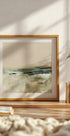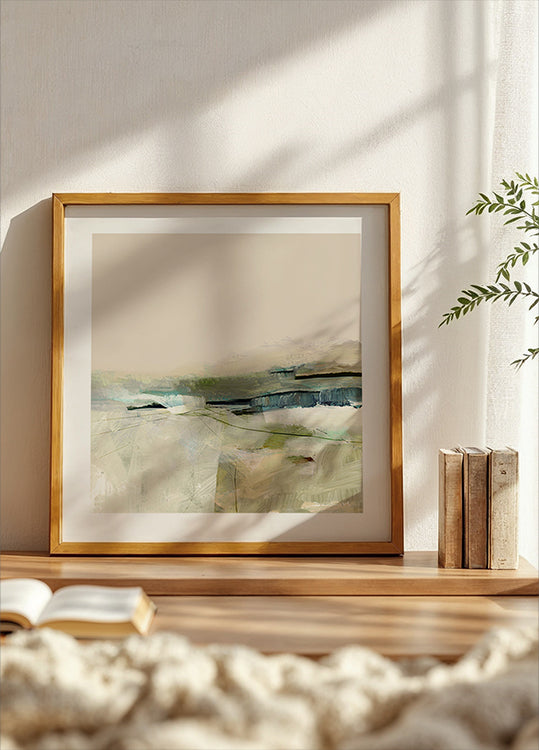 Et blødt, abstrakt landskab i lyse beige, grønne og blå toner. Penselstrøgene skaber en fornemmelse af horisont, marker og himmel, mens farverne giver et roligt, drømmende og organisk udtryk.