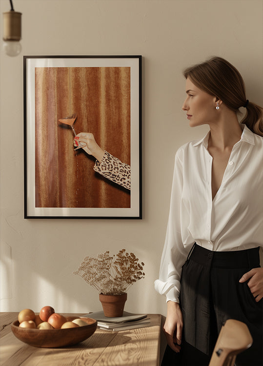 Et stilrent, retroinspireret motiv: en hånd løfter et glas og lader en gylden cocktail glide i glitrende dråber, fanget i et stille øjeblik før skålen. Varme toner af orange og guld møder bløde skygger og studiokulisse, der giver billedet en festlig, nostalgisk barstemning og tidløs elegance. Et billede fyldt af liv, lyst og skål.