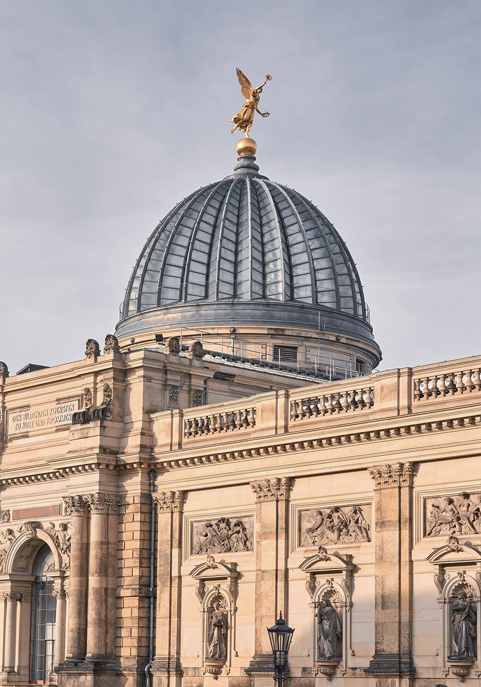 Plakaten viser en smuk bygning med en karakteristisk kuppel toppet med en gylden statue af en bevinget figur. Bygningens facade er udsmykket med detaljerede skulpturer og ornamenter. Det er en lækker kombination af klassisk arkitektur og en moderne himmel, som bidrager til et etisk risiko og majestætisk udtryk.