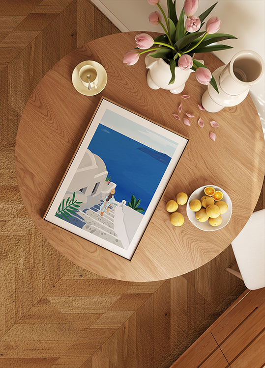 Into the Blue af Petra Lizde fanger essensen af Santorinis hvide huse mod det dybblå hav. En elegant kvinde med parasol træder ud på en solbeskinnet terrasse, omgivet af klare linjer, skygger og azur nuancer. En minimalistisk, grafisk hyldest til sommer, ro og eventyrlyst. Perfekt som drømmende vægkunst til stuen, soveværelset eller sommerhus.