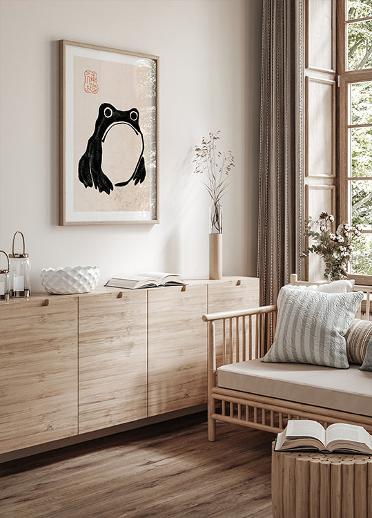 Et minimalistisk japansk blækværk, der skildrer en stiliseret sort frø med dristige, udtryksfulde linjer. Designet fremhæver en harmonisk balance mellem enkelhed og form, karakteristisk for traditionel japansk sumi-e-maleri. Et elegant rødt segl i øverste hjørne tilføjer autenticitet og kulturel betydning. Perfekt til dem, der beundrer østlig æstetik, minimalisme og naturinspireret kunst.