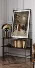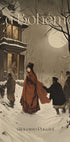 En stemningsfuld vintageplakat, der hylder Giacomo Puccinis La Bohème: en vinteraften i sne og måneskin, hvor en lille gruppe samles foran teaterets facade. Røde accenter bryder kulden, træernes silhuetter rammer scenen, og sang, venskab og storbyens poesi anes i den historiske illustration. En hyldest til romantik, operaens magi og vinteropoesi.