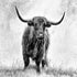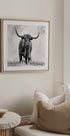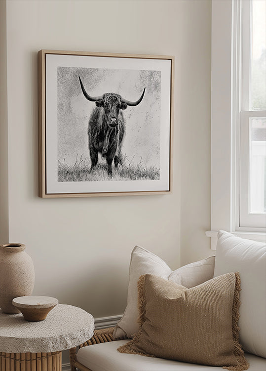 En ikonisk skotsk højlandskvæg træder frem i dramatisk sort-hvid, med mægtige horn og dyb blikretning, fanget i et højnøglet lys, der fremhæver struktur og ro. La force af Stéphane Pecqueux forener rå styrke og landlig poesi—et tidløst motiv, der bringer naturens nærvær og nordisk enkelhed ind i rummet.