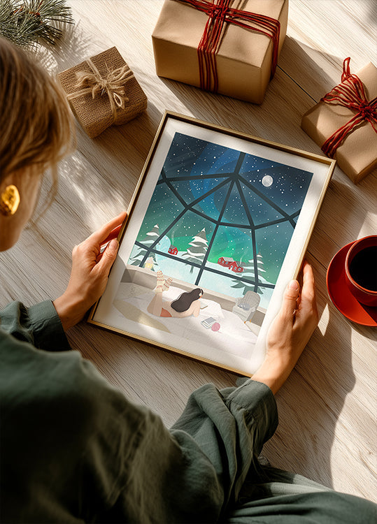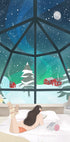 Under nordlysets dans over Laplands snedækkede graner skinner en glasiglo som en varm lygte i natten. Indenfor sidder en kvinde med en bog og katten ved fødderne, indhyllet i ro og vintermagi. Petra Lizdes illustration balancerer eventyr og hygge og inviterer til drømme om nordens stille nætter. En perfekt hyldest til den arktiske nat.
