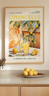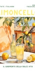 Limoncello La Dolce Vita-plakat indfanger essensen af en solrig italiensk sommer, hvor gyldne citroner hænger tungt fra frodige grønne grene mod en baggrund af rustikke terracottatage. På en solbeskinnet terrasse står en flaske og et glas frisklavet limoncello klar til at invitere dig til at nyde sødmen og friskheden ved den mediterrane livsstil. Dette akvarelinspirerede kunstværk udstråler varme og afslapning, perfekt til at bringe et strejf af Italien ind i køkkenet, spisestuen eller på en sommerinspireret gallerivæg.