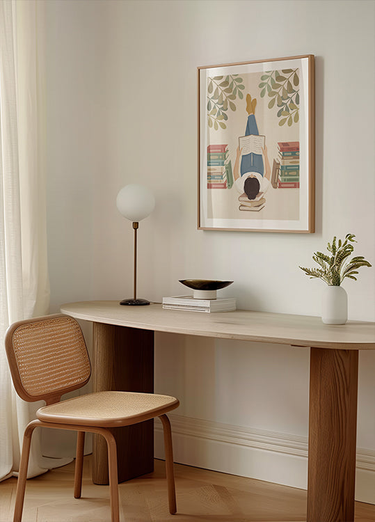 En rolig, eftertænksom scene: en person ligger på ryggen fordybet i en bog, mens verden omkring falder i baggrunden. Motivets stille nærvær hylder læseglæden og hverdagsøjeblikkets poesi. En enkel, moderne illustration af Andreas Magnusson, der indfanger ro, fordybelse og tidløs charme. Perfekt til læsehjørnet.
