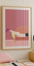 En charmerende og finurlig illustration af en kvinde, der ligger på hovedet over en sofa i vintagestil, iført legende mønstre og farverige hæle. Den dristige lyserøde farvepalette og det minimalistiske design giver en følelse af humor og moderne charme, hvilket gør dette til det perfekte statement-værk til soveværelser, stuer eller kreative rum.