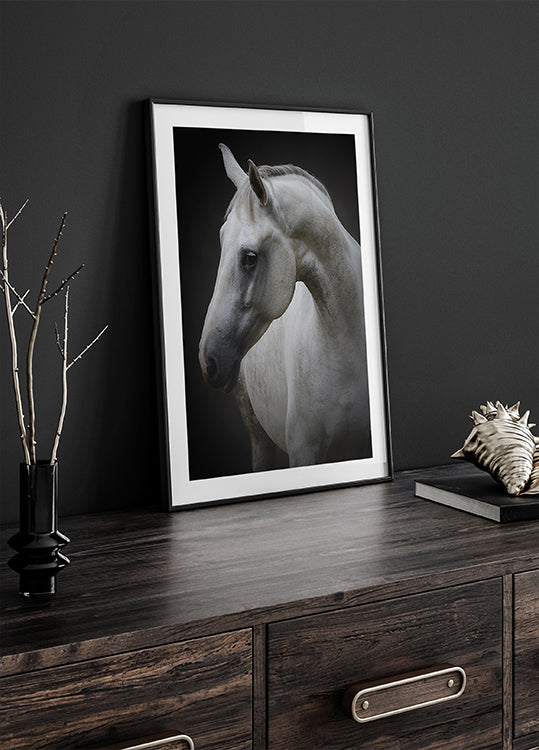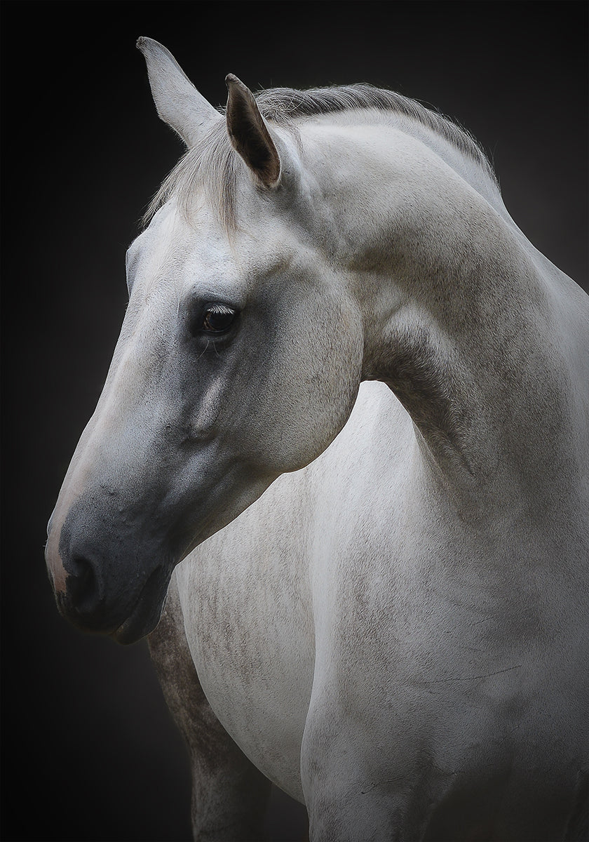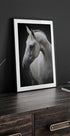 Maggie af Avishai Avivi indfanger en hoppe i rolig profil: den elegante bue i halsen, en blød, flydende manke og et afdæmpet, neutralt bagtæppe. Fin minimalisme og skånsomt lys fremhæver dyrets ynde og styrke, så motivet emmer af nærvær, varme og tidløs, skandinavisk ro. Et poetisk portræt til moderne, rolige rum.