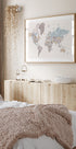 Opdag verden i et elegant overblik: En højdetaljeret verdenskort-plakat med tydelige bymarkeringer, malet i bløde akvarelteksturer og afdæmpede pasteltoner på ren hvid baggrund. Kontinenter og kyster træder skarpt frem, perfekt til dagdrømme og rejseplaner. Af Rosana Laiz Blursbyai. Et moderne blikfang i både hjem og kontor.