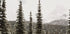 Tårnhøje grantræer står yndefuldt med en tåget bjergbaggrund. Deres snedækkede grene tilføjer en fredfyldt stemning til det rolige landskab og understreger naturens storhed. Kombinationen af skov og bjerge vækker en følelse af vildmark og uberørt skønhed.