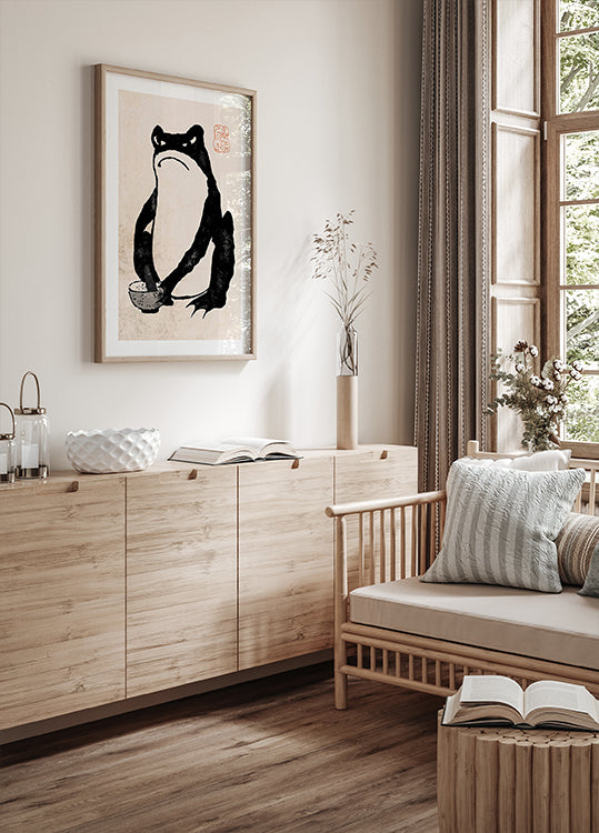 Et fascinerende japansk blæktegning, der viser en intens frø i en traditionel scene. De kraftige penselstrøg og sumi-e-stilen skaber en tidløs æstetik, der kombinerer humor med klassisk japansk kunst. Frøen, tegnet med stærke sorte linjer, synes at røre ris i en skål og udstråler en følelse af disciplin og ro. Et rødt signaturstempel understreger kunstværkets autenticitet. Perfekt for dem, der elsker traditionel asiatisk kunst, blæktegninger og unikke dyreillustrationer.