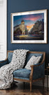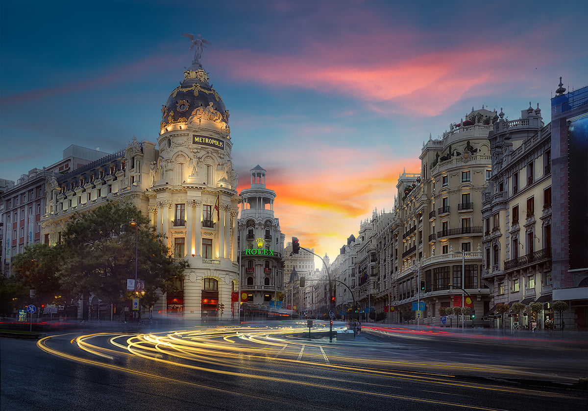 Et tidløst kig ned ad Madrids Gran Vía, hvor den ikoniske Metropolis-bygning lyser op i skumringen. Lysstriber fra trafikken tegner dynamiske linjer omkring den klassiske facade med den gyldne kuppel. En stemningsfuld hyldest til byens puls, fortolket af fotografen Fernando Molina. Optaget i lang eksponering, der indfanger bevægelse og energi.