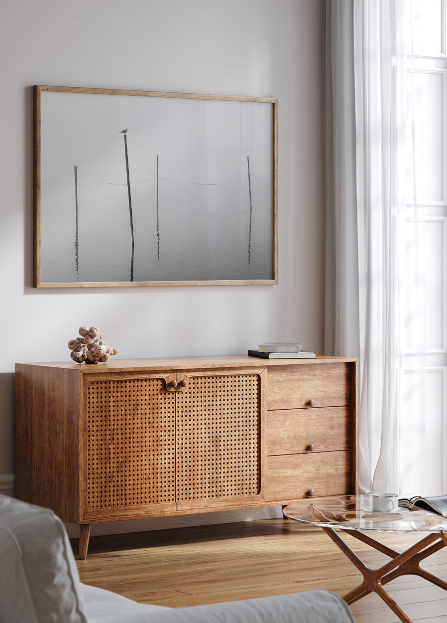 Plakaten viser en stemningsfuld, sort-hvid scene med tåge, der dækker vandet. Tre stolper rager op fra den spejllignende overflade, med en enlig fugl på den højeste. Refleksioner af polerne kan ses i vandet, og atmosfæren er stille og mystisk, hvilket giver en følelse af ro og isolation.