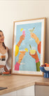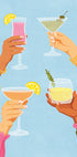 En livlig og farverig illustration, der fejrer venskab og glæde. Fire hænder løfter deres cocktailglas i en munter skål mod en lys blå baggrund, fuld af varme, positivitet og fællesskab — perfekt til moderne køkkener, barer eller stuer.