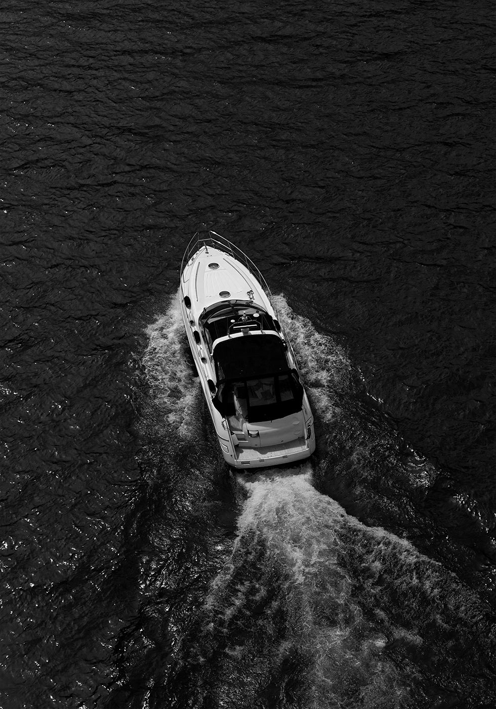 En elegant yacht skærer gennem det mørke vand i markant kontrast, fanget ovenfra i raffineret monokrom. Dette minimalistiske motiv hylder frihed, præcision og bevægelsens æstetik – ideelt til moderne indretninger med sans for stil og ro.