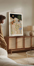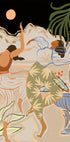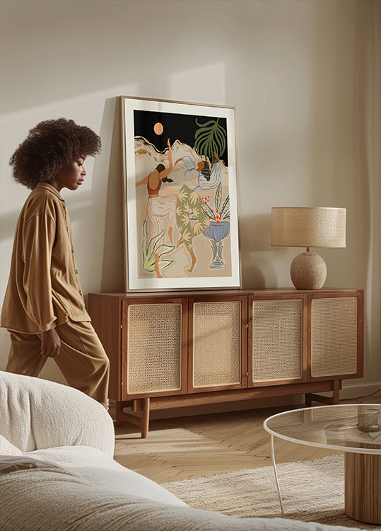 Moonlit Dance Plakat indfanger et øjeblik af ren glæde og frihed, hvor to kvinder bevæger sig yndefuldt under det varme skær fra en fuldmåne. Med en drømmende palette af jordnære beige nuancer, dyb sort og frodig grøn, forenes naturen med den udtryksfulde menneskelige form. Løse, maleriske linjer og tekstureret skygge giver værket en dynamisk, næsten æterisk kvalitet. Flydende klæder med striber og bladmønstre svajer med bevægelsen, mens omgivende planter og en klassisk urne tilfører elegance. Dette kunstværk udstråler en sorgløs ånd og fungerer som et imponerende midtpunkt i boheme, moderne eller naturinspirerede interiører.