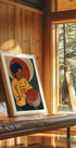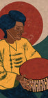 En vibrerende, grafisk illustration af en trommeslager i traditionel dragt, omgivet af geometriske mønstre og varme gule nuancer. Pulserende rytme og kulturelle motiver smelter sammen til et stærkt, moderne udtryk. Skabt af kunstneren Gulcihan Ozguc – perfekt som iøjnefaldende vægkunst. Giver rummet karakter og rytme.
