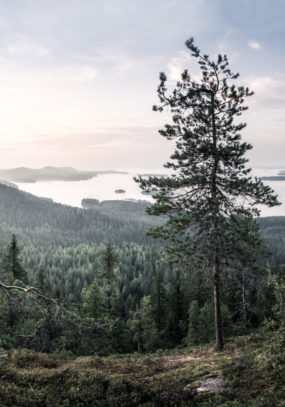 Et fredfyldt landskab, der indfanger skønheden i en nordisk skov med udsigt over en stor sø. Et ensomt fyrretræ står i forgrunden, mens uendelige lag af nåletræer forsvinder i den tågede horisont. Den bløde pastelhimmel forstærker den rolige og drømmende atmosfære, hvilket gør dette kunstværk til en perfekt tilføjelse til en naturinspireret indretning.