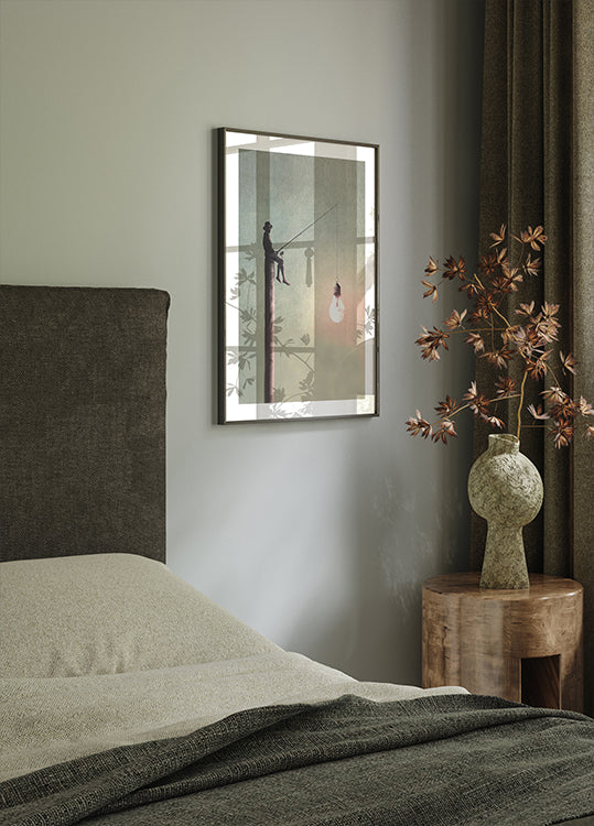 En surrealistisk og tankevækkende kunstplakat, der viser en ensom fisker siddende på en pæl, der fisker efter en lysende pære. Dette fantasifulde motiv symboliserer kreativitet, inspiration og jagten på nye idéer – perfekt til et arbejdsrum eller kreative omgivelser.
