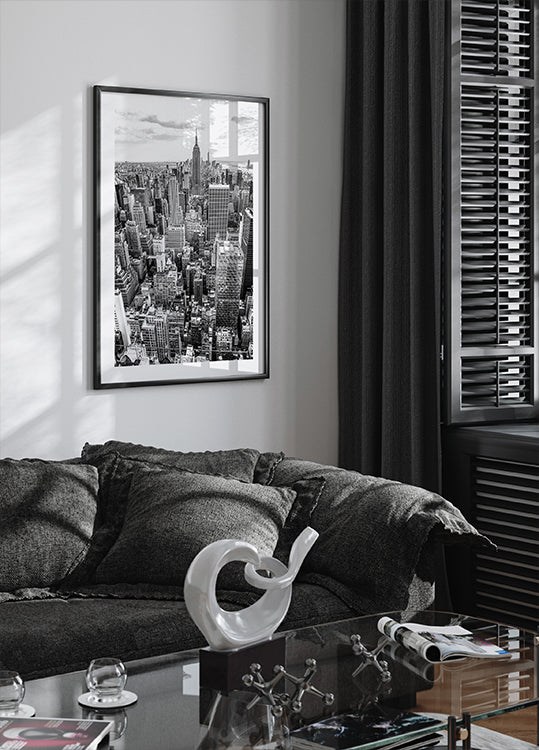Et markant sort-hvid fotografi af New York Citys skyline, med den ikoniske Empire State Building, der troner over den tætte bybebyggelse. Den høje kontrast fremhæver arkitektoniske detaljer og gør denne plakat til et stilfuldt valg for storbyelskere, rejsende og moderne indretning.