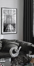 Et ikonisk vinterøjeblik fra New York: En ensom skikkelse vandrer hen over Brooklyn Bridge i tæt snefald. De stramme kabler og broens gotiske buer danner en grafisk, sort-hvid geometri, der leder blikket mod horisonten. Et stemningsfuldt motiv af fotografen Martin Froyda. Kulden sitrer i luften, mens snefnug slører byen bag ham.