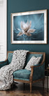 Dette elegante makrofotografi fanger en delikat blomst i bløde hvide og blå nuancer, hvor kronbladenes årer og glitrende dugdråber fremhæves. Den drømmende stemning og de detaljerede nærbilleder skaber et sofistikeret og beroligende kunstværk, perfekt til en moderne botanisk billedvæg.
