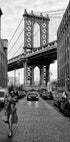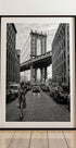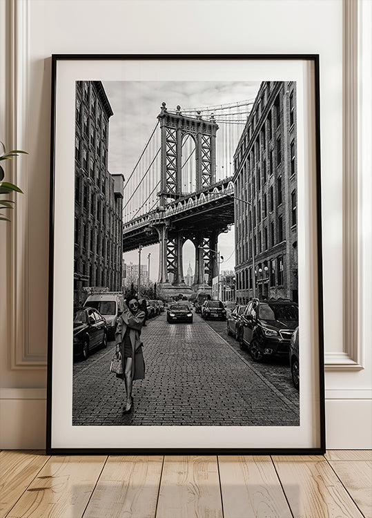 Et tidløst sort-hvidt bylandskab, der fanger den ikoniske Manhattan Bridge indrammet mellem klassiske murstensbygninger i Brooklyn, med Empire State Building perfekt placeret i horisonten. Den stilfulde skikkelse i forgrunden tilfører et strejf af urban elegance, hvilket gør dette tryk til en slående kombination af arkitektur, mode og New York-energi. Perfekt til moderne indretninger og til dem, der elsker byfotografi.