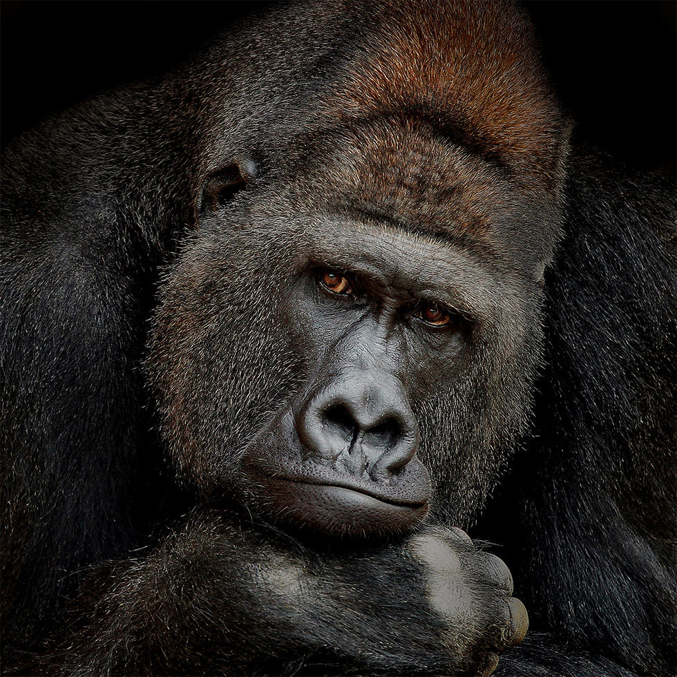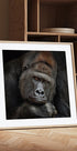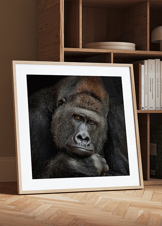En intens, lavmælt portrætplakat af en majestætisk silverback-gorilla fanget i et øjebliks stille eftertanke. De dybe, vise øjne møder dine og skaber nærvær, sårbarhed og styrke på samme tid. Skyggerne fremhæver de markante træk og giver motivet en tidløs, skulpturel ro. Af Antje Wenner-Braun. Titlen er ONE MOMENT IN CONTACT.