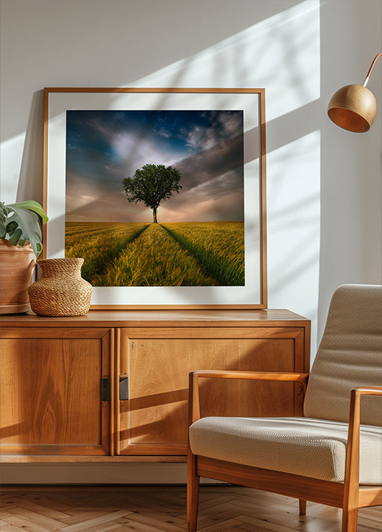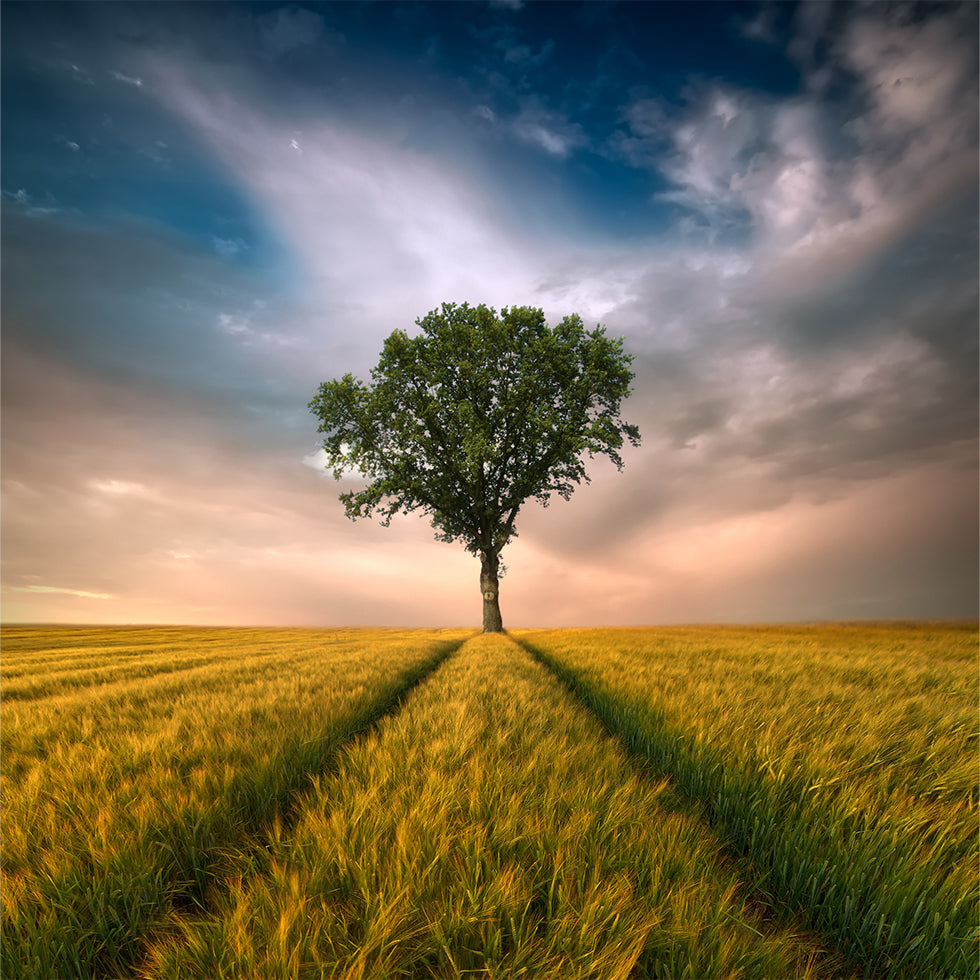 One af fotografen Piotr Krol (Bax) fanger et ensomt træ midt i et bølgende, gyldent hvedefelt. Bløde hjulspor skærer gennem landskabet og leder blikket mod horisonten, hvor varmt sommerlys møder en vidåben himmel. Et stille, poetisk øjeblik fra det polske land, fyldt med ro, dybde og perspektiv. Og håb.