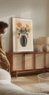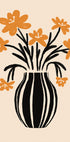 En glad og moderne illustration af lyse orange blomster i en markant sort-hvidstribet vase. Det legende design og de varme toner bringer et friskt, kunstnerisk præg til ethvert rum — perfekt til køkkener, stuer eller gallerivægge, der har brug for et farverigt pift.