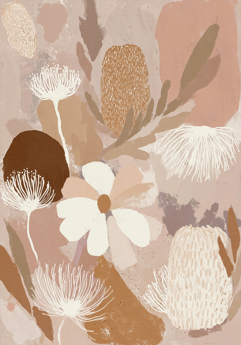 En varm og beroligende botanisk komposition med abstrakte blomstermotiver i bløde jordnære toner af beige, blush og brun. De lagdelte teksturer og organiske former skaber et harmonisk og elegant design, der blander moderne minimalisme med naturlig inspiration. Denne plakat er perfekt til skandinavisk, japansk eller moderne interiør og bringer en følelse af balance og ro i stuer, soveværelser eller kuraterede gallerivægge.