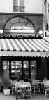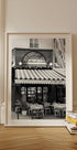 Et charmerende sort-hvidt fotografi af den parisiske café La Marquise, med stribet markise, bistrostole og tidløs gadeatmosfære. Dette print indfanger den franske cafékultur og bringer et autentisk parisisk præg til hjemmet, samtidig med at det vækker romantikken i hverdagslivet i Lysets by.