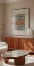 Pattern in Contrast af THE MIUUS STUDIO forener stramme linjer, grid og rytmiske striber med bløde, organiske former. I neutrale nuancer af beige, sort og brun skaber kompositionen et roligt, grafisk udtryk med tydelig dybde og kontrast—ideel til minimalistisk, moderne og midcentury inspireret indretning.