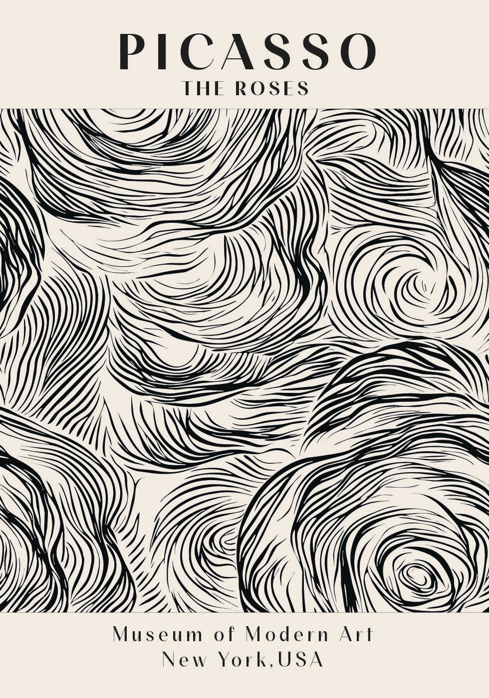 En moderne abstrakt plakat inspireret af Picasso, med hvirvlende sorte linjer, der danner et indviklet mønster af roser. Den højkontrasterede sorte og beige palet fremhæver det kunstneriske og sofistikerede udtryk. En hyldest til samtids- og abstrakt kunst, perfekt til moderne interiører og kunstelskere.