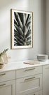 Et intenst nærbillede af en ananas fanger bladkronens skulpturelle former og skalens grafiske mønster i dybe grønne og gyldne nuancer. Den stramme beskæring og bløde studielys skaber et roligt, moderne udtryk med frisk tropisk energi og sanselig tekstur, der løfter rummet. Perfekt som roligt fokus i køkken eller stue.