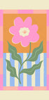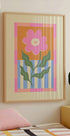 Legesyg lyserød blomst plakat er en charmerende og munter blomsterillustration med et retroinspireret design. Den viser en stor, lys lyserød blomst med bløde kronblade og grønne blade, sat mod en varm orange baggrund med blå og hvide striber, indrammet af en lyserød ternet kant. Kompositionen udstråler optimisme og legesyge, hvilket gør den perfekt til moderne, eklektiske eller vintageinspirerede interiører. Ideel til at lyse op køkkener, soveværelser eller kreative rum, tilføjer den et pift af farve og glæde til enhver billedvæg.