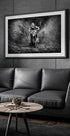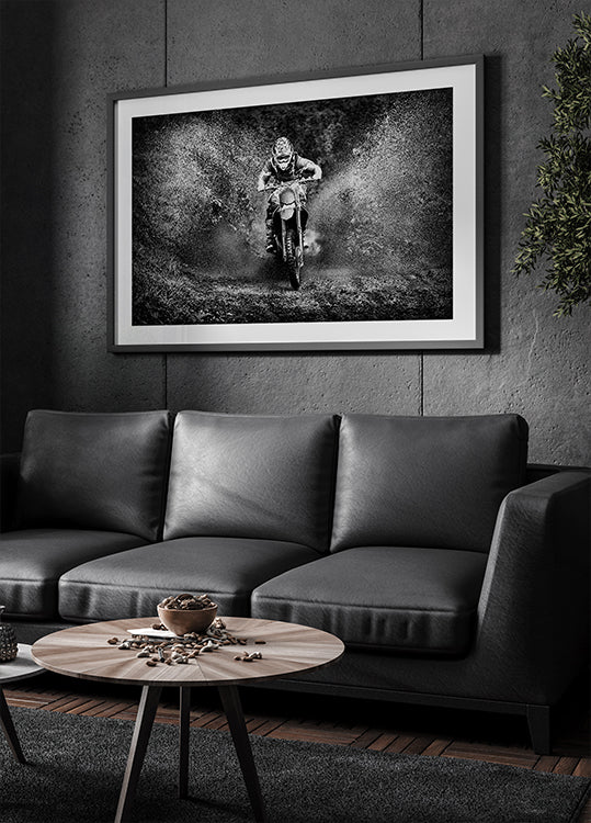Et dramatisk sort-hvidt motiv af en motocrosskører, der brager gennem mudder og vand. Plakaten udstråler fart, energi og rå adrenalin. Den eksploderende sprøjt rammer rytteren i et øjeblik af intensitet og gør den til et markant statement for motorsportsfans og elskere af kraftfulde billeder.