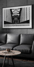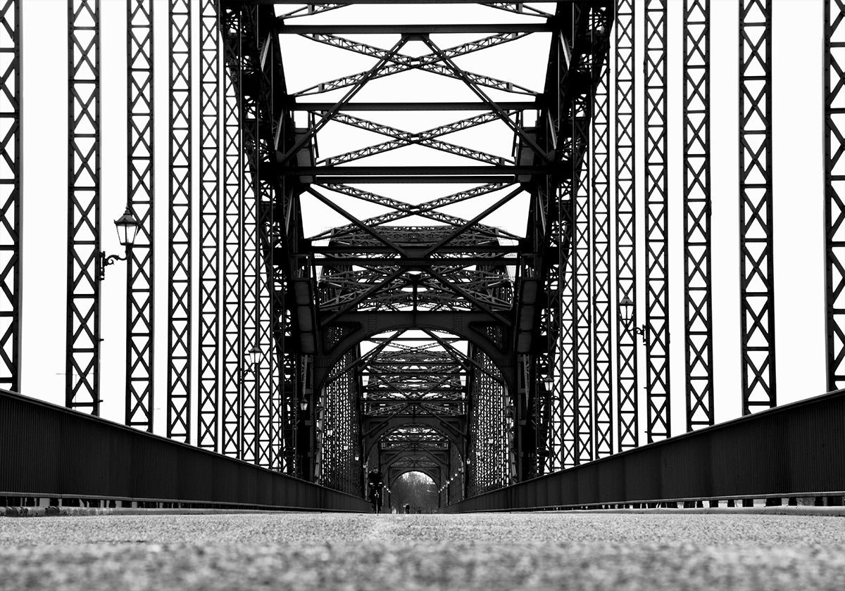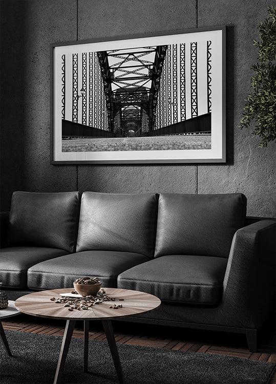 Dette slående sort-hvide fotografi fanger den stærke geometri i en stålkonstruktion i Hamburg. De gentagne jernmønstre, skarpe kontraster og dybe perspektiv skaber et dristigt arkitektonisk kunstværk, der kombinerer industriel skønhed med tidløst design, perfekt til en moderne og grafisk billedvæg.