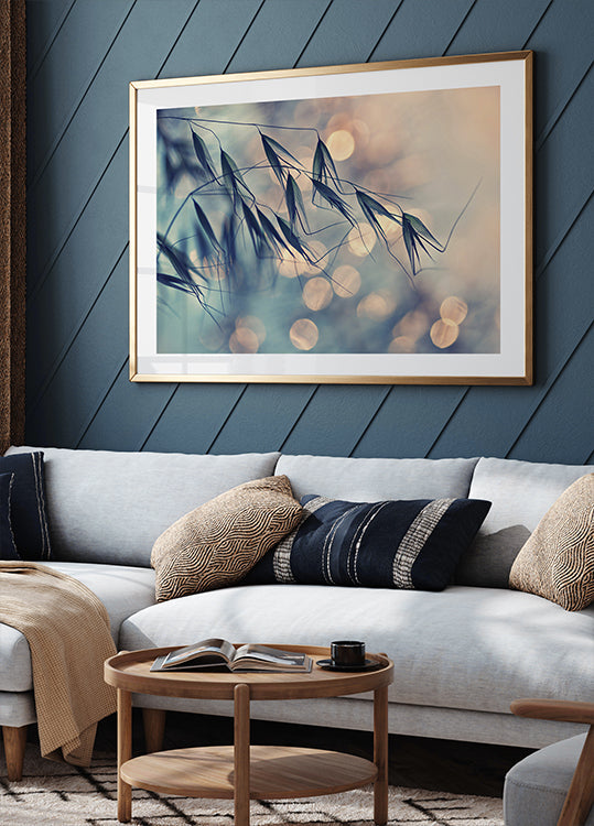 Dette rolige nærbillede fanger sarte græsstrå mod en drømmende pastelfarvet baggrund med blødt bokeh-lys. Den fredelige stemning og skrøbelige elegance skaber et beroligende kunstværk, der udstråler harmoni, stilhed og ro, perfekt til en afslappende billedvæg.