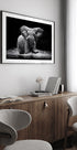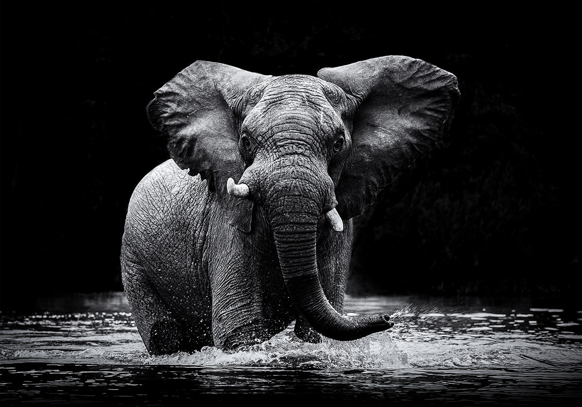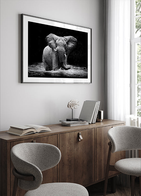 En dramatisk sort-hvid plakat af en elefant, der bryder gennem vandet i Kafue-floden i Zambia. Low-key lys fremhæver rynker, muskler og vandsprøjt, mens den majestætiske ro står i kontrast til kraften. Fotograferet af Gorazd Golob – et stærkt, tidløst motiv til moderne rum. Perfekt som blikfang i stue, kontor eller galleri.